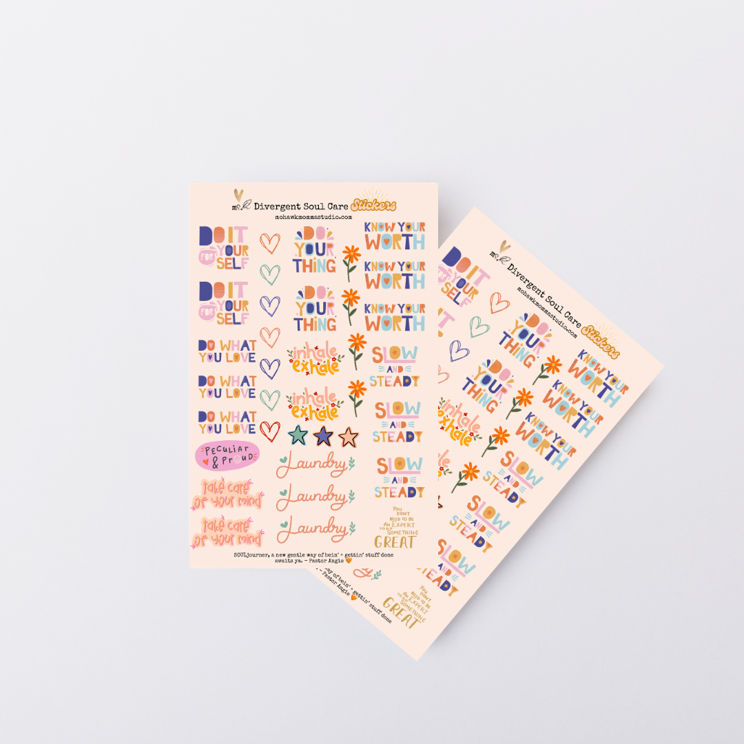 Diviértete celebrando con hojas de pegatinas súper suaves y que afirman el neurodivergente sobre el cuidado del alma.
